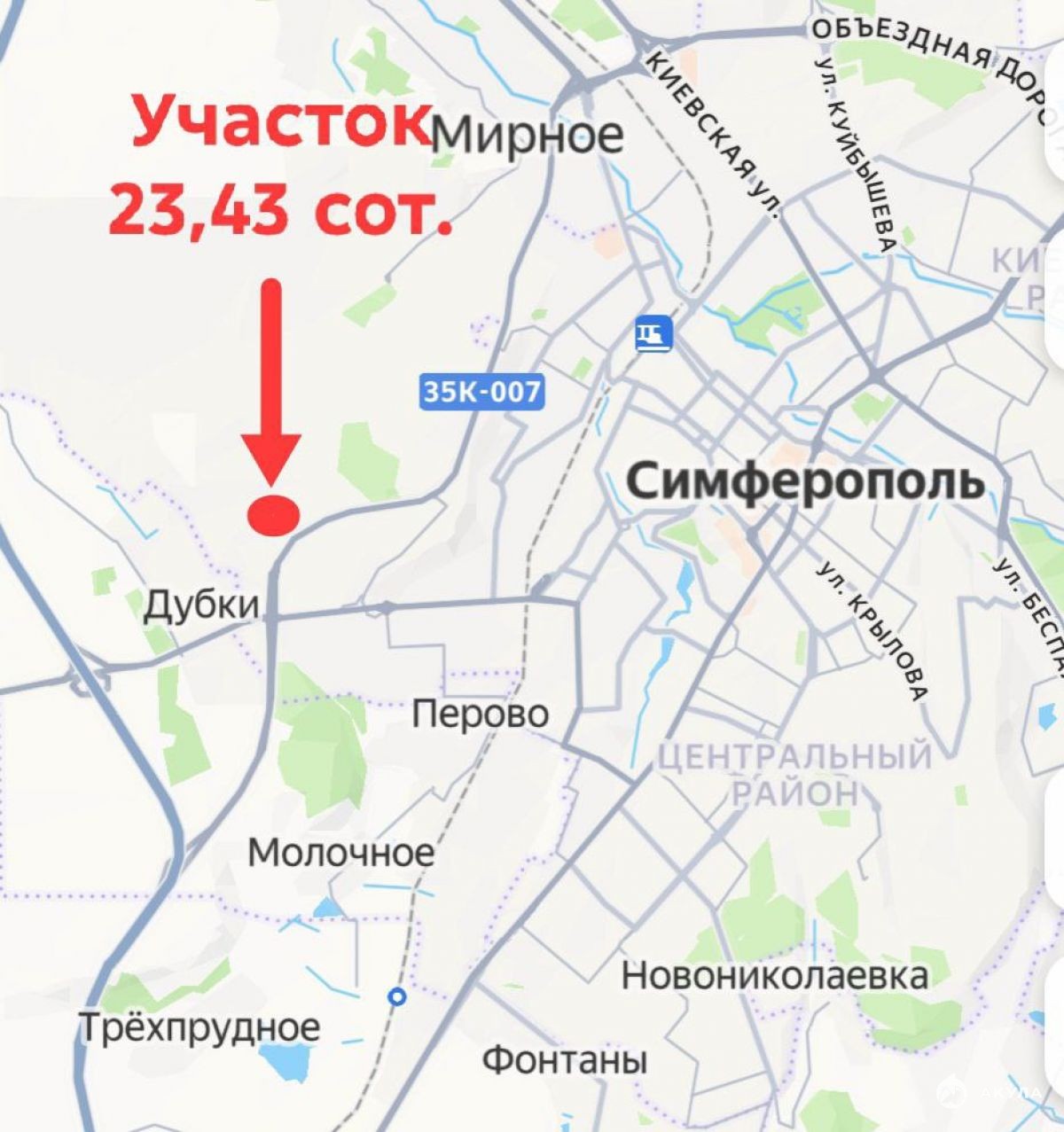 ✔️ Участок расположен на первой линии Симферопольской объездной, перед съездом на автодорогу Симферополь – Николаевка. Заезд как со стороны села Мирное, так и села Дубки.